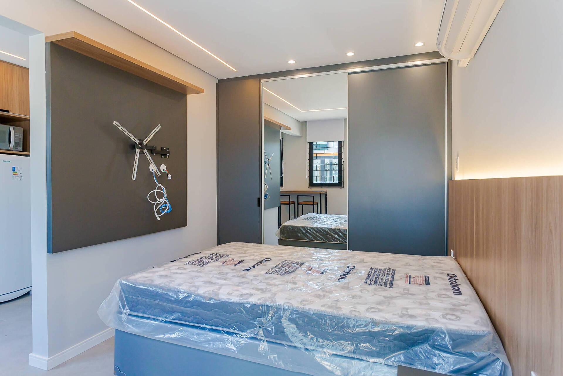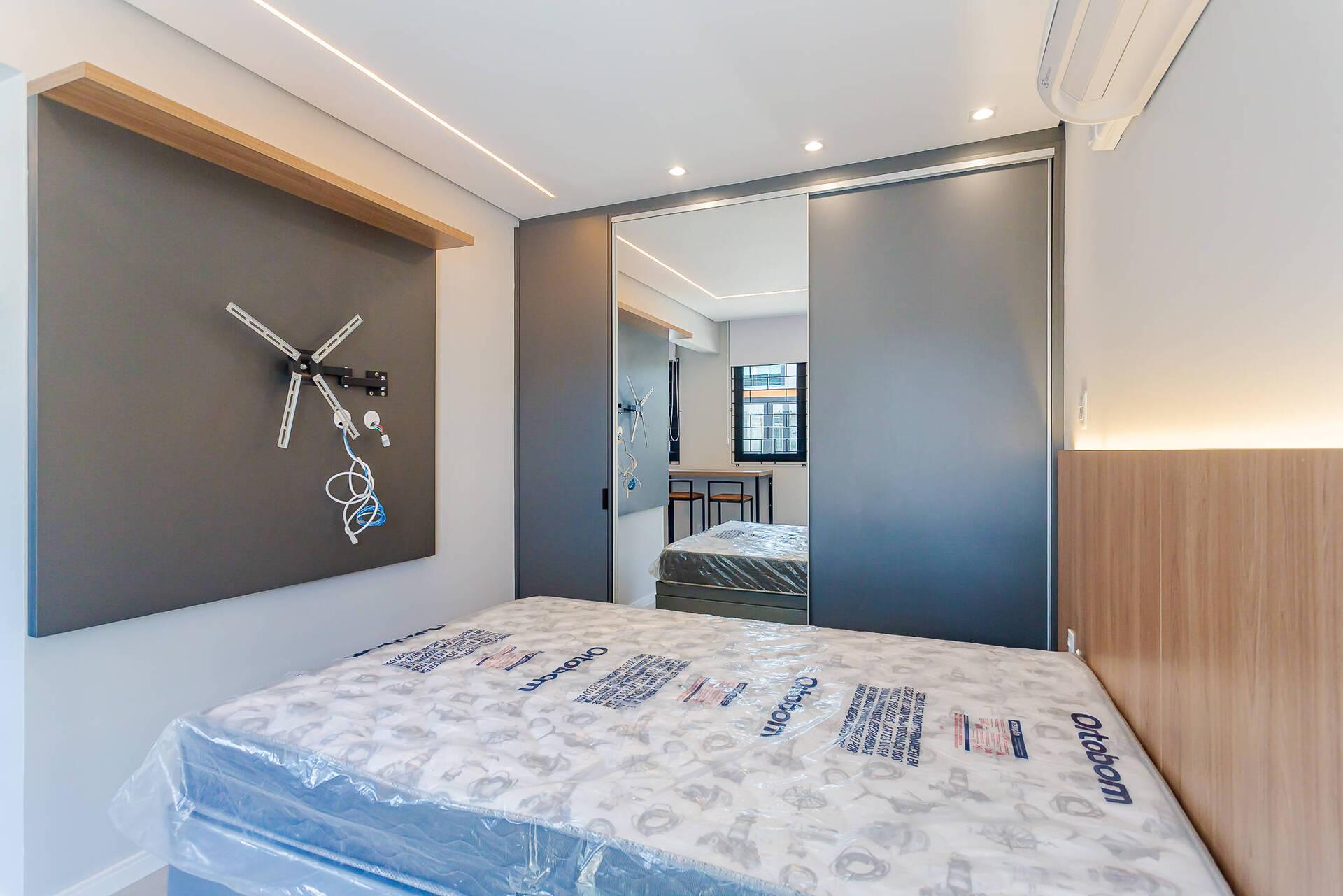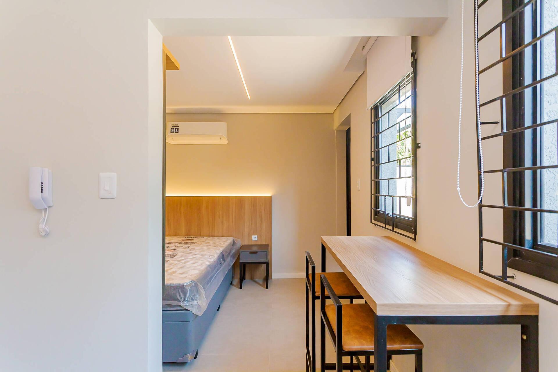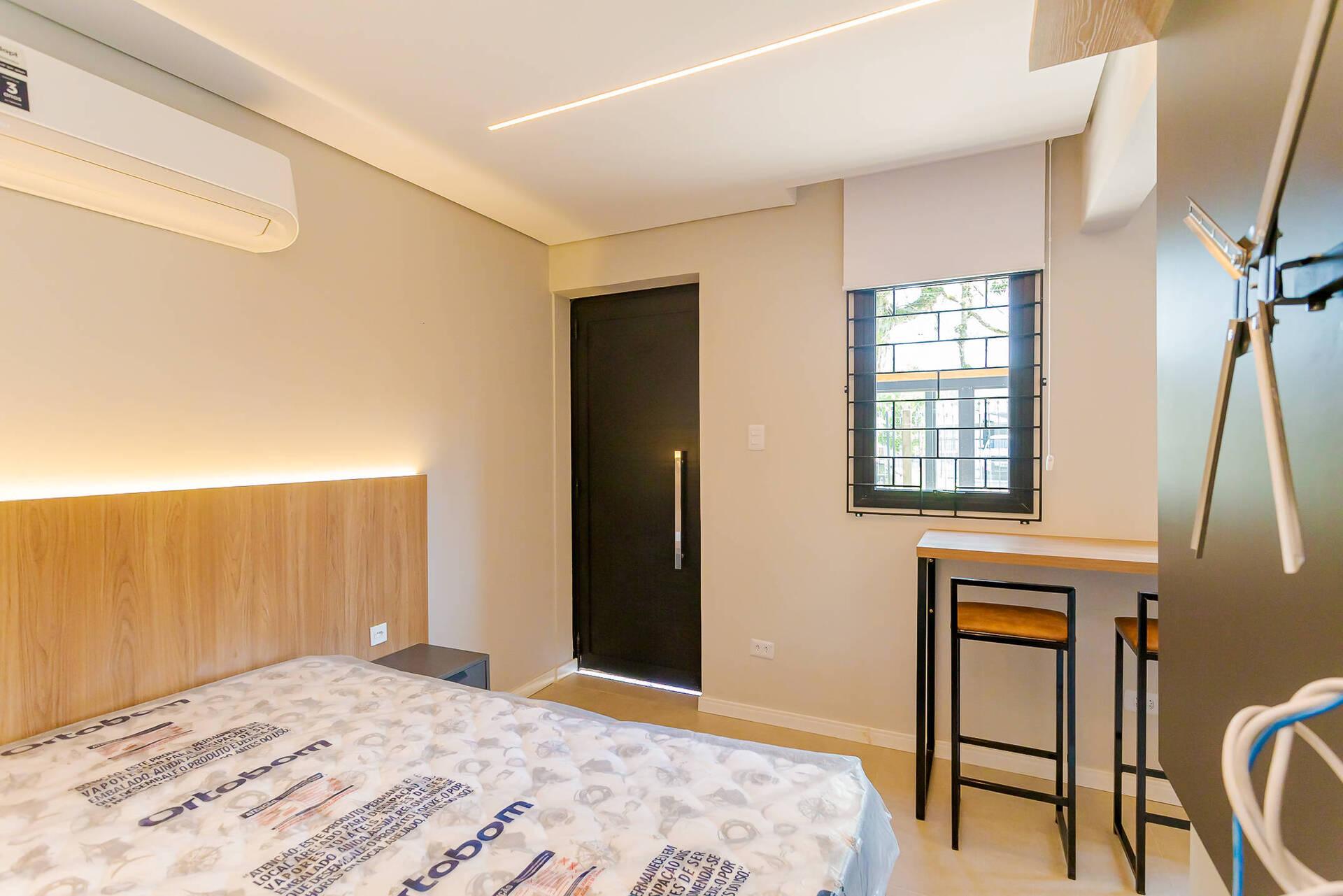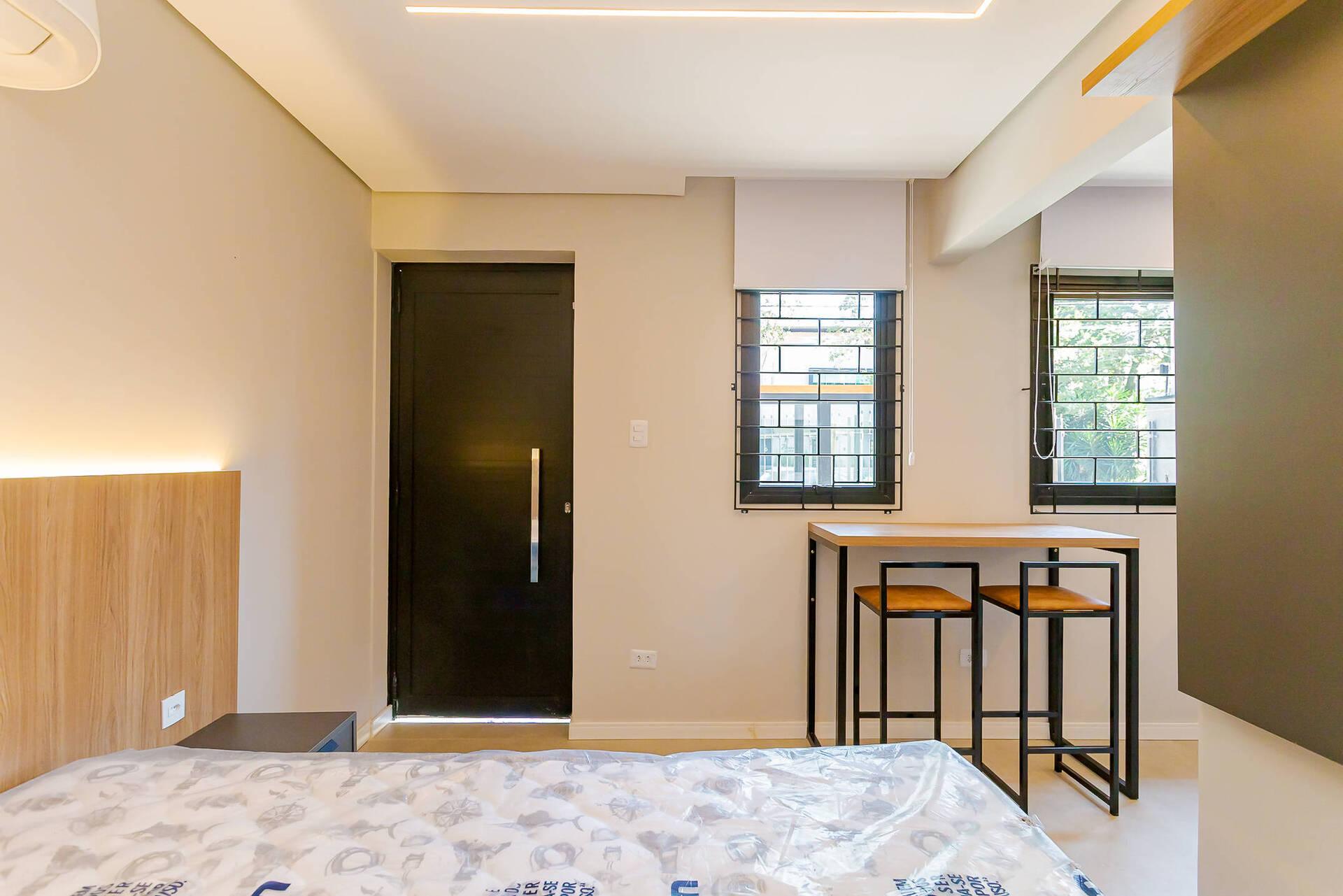- Totalmente mobiliada com móveis planejados, incluindo cama box (baú), guarda roupas, armário, mesa com cadeiras, home office, ar condicionado split (quente e frio), ponto para máquina de lavar, banheiro com armário espelhado e box.