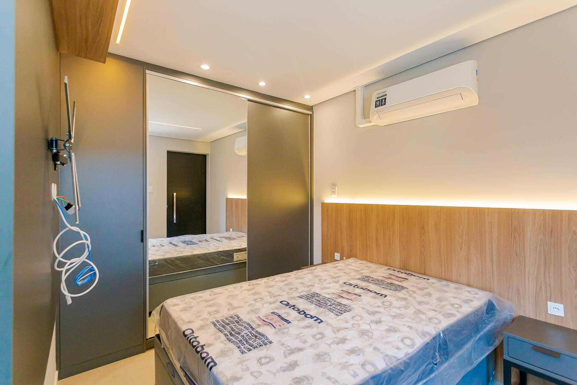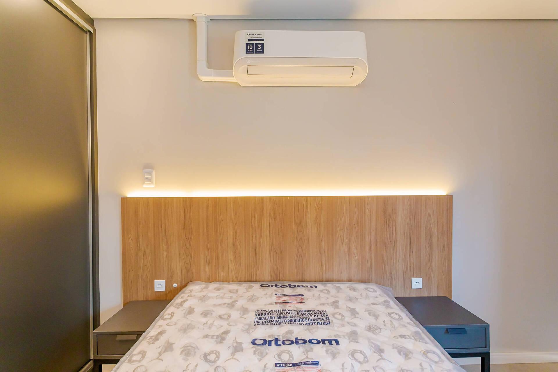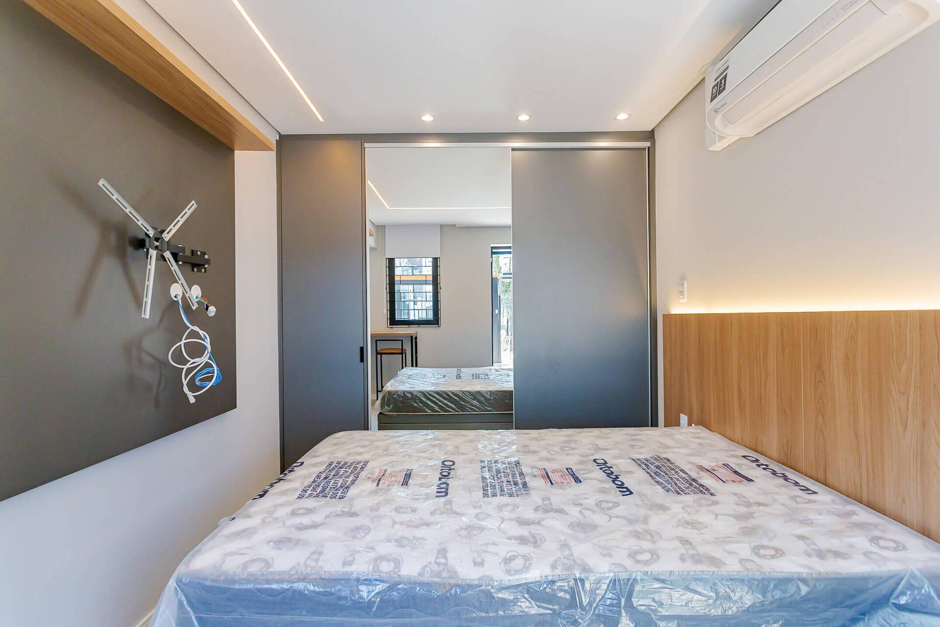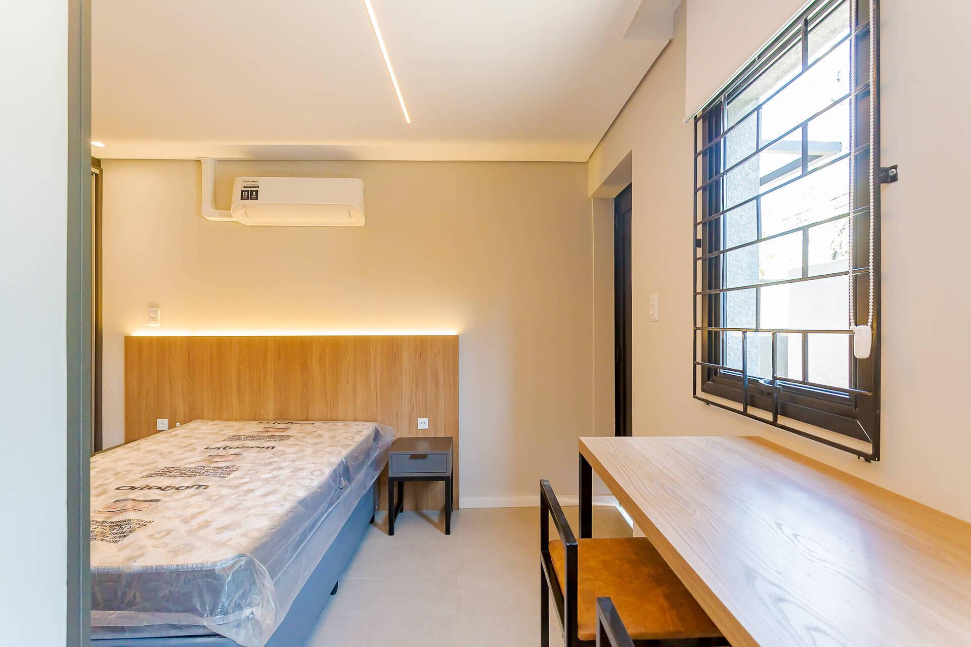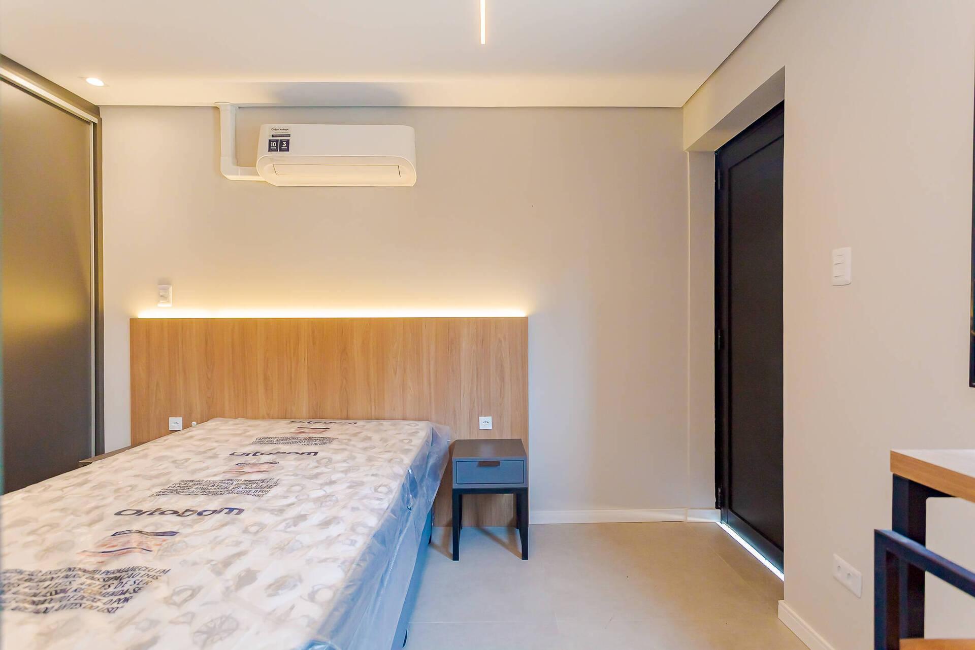 - Totalmente mobiliada com móveis planejados, incluindo cama box (baú), guarda roupas, armário, mesa com cadeiras, home office, ar condicionado split (quente e frio), ponto para máquina de lavar, banheiro com armário espelhado e box.