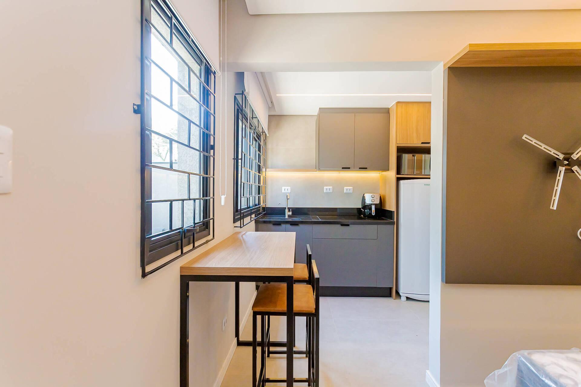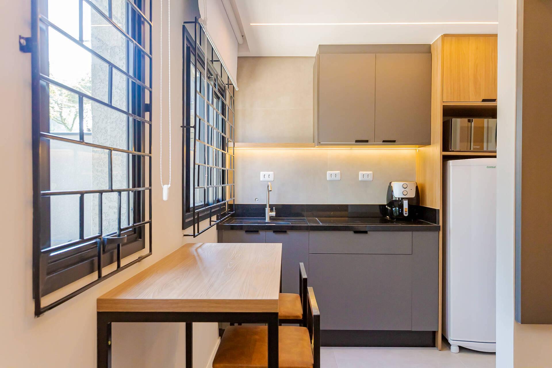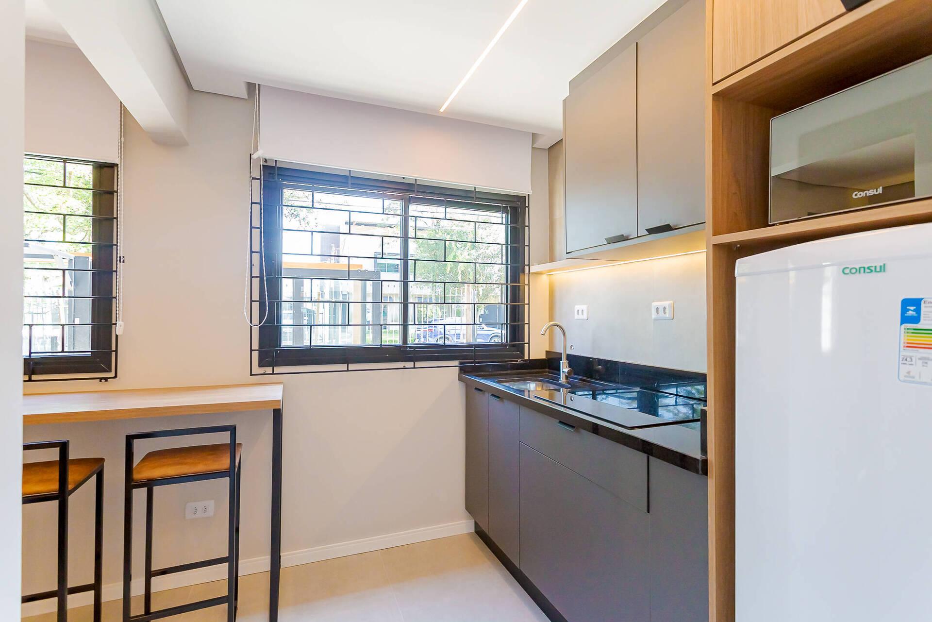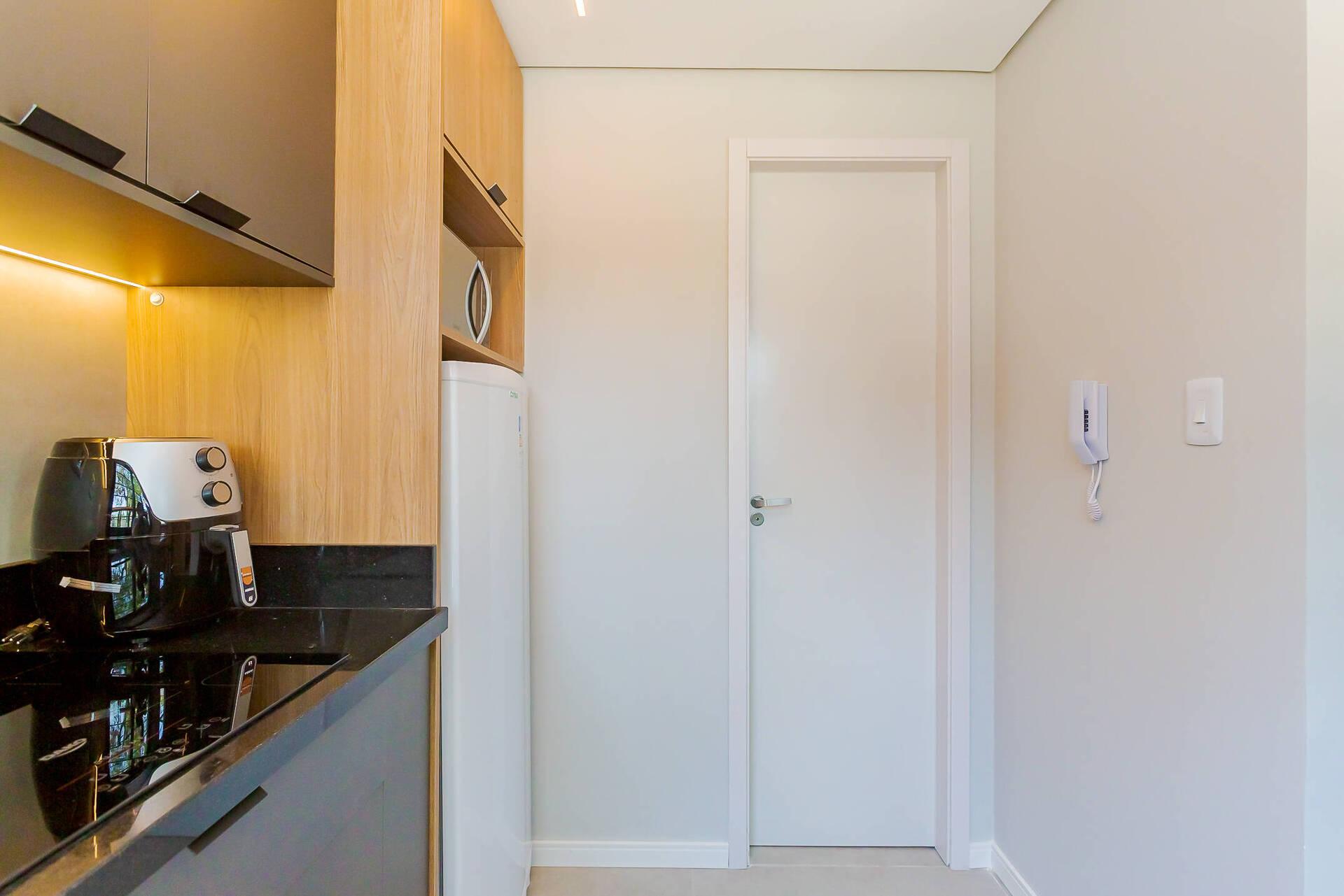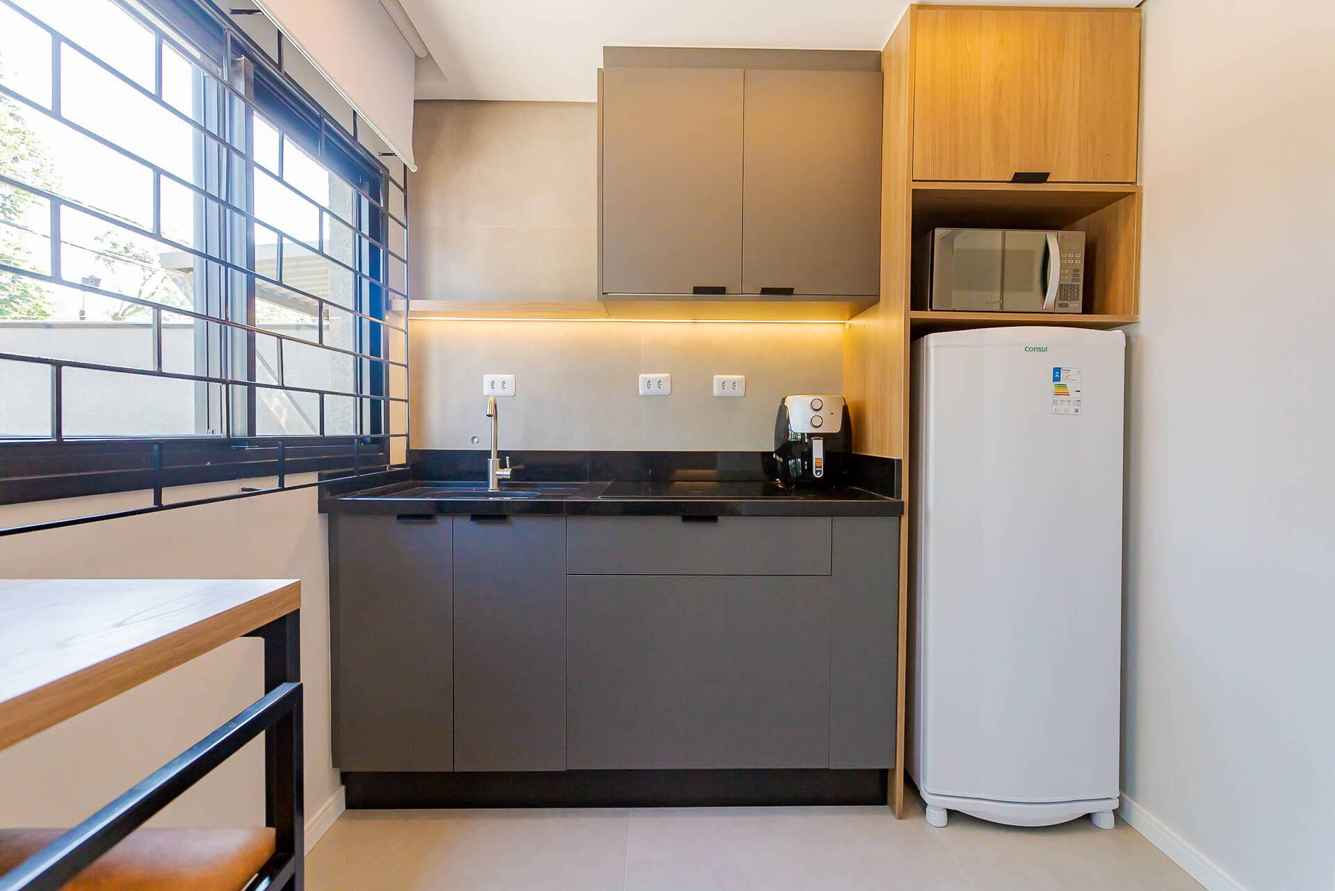 - Cozinha equipada com eletrodomésticos novos (geladeira, micro-ondas, cooktop 4 bocas, airfry, chaleira elétrica).