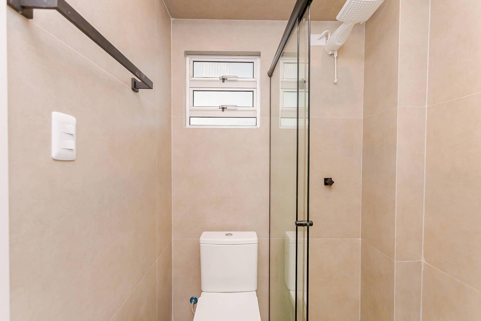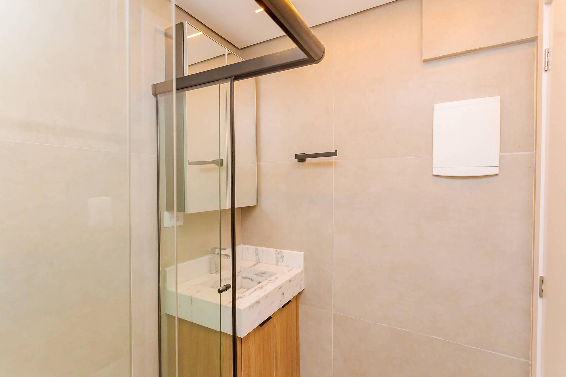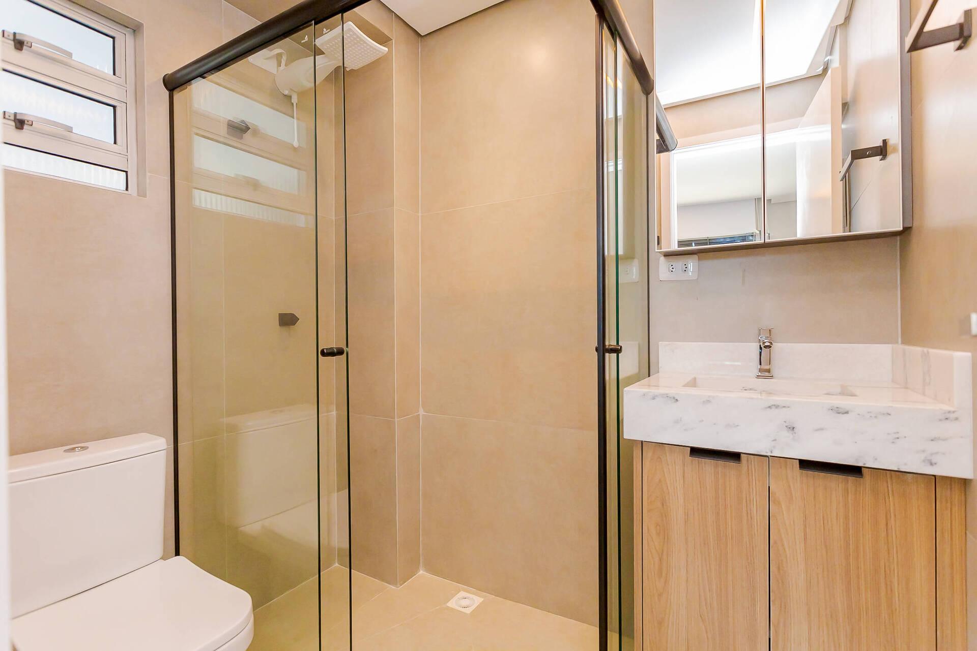 - Banheiro espaçoso com box em vidro e detalhes sofisticados com espelho.